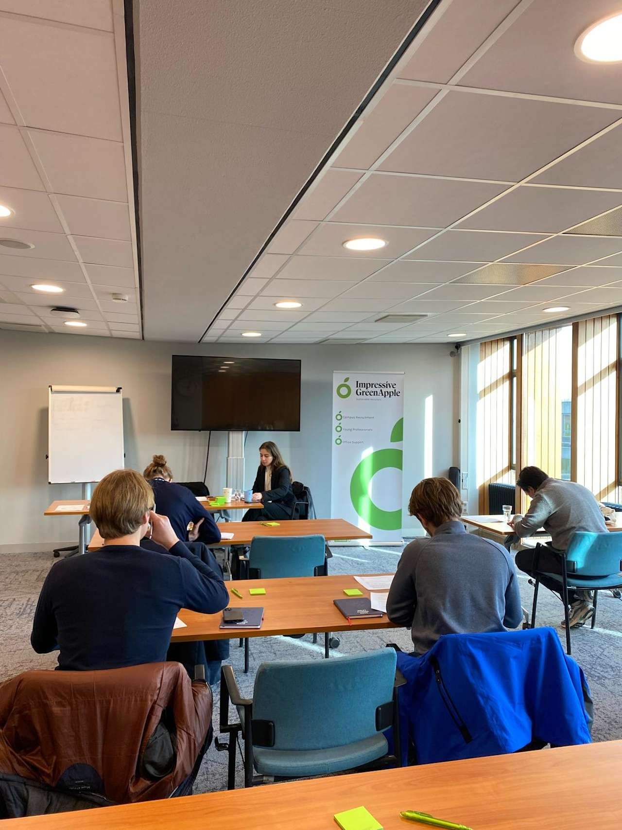 Aangezien ik zelf ook nog in mijn afstudeerfase zit, was het voor mij interessant om deel te nemen aan de assessment training als student om zo te ervaren hoe het nou is om zelf zo’n training te volgen. Na het opstellen van de ruimte voor de training, liep het lokaal langzaam aan vol. Ik nam vervolgens plaats op de eerste rij tussen de rest. Na een korte introductie en uitleg van Irène, mochten we aan de slag. Als eerst begonnen we met een individuele oefening waarbij je figuurreeksen oplost onder tijdsdruk. Verrassend genoeg vond ik het eigenlijk best leuk om die oefeningen te maken, omdat het voelt als een logische puzzel die je moet oplossen waarbij de tijdsdruk je wat spanning en uitdaging geeft.